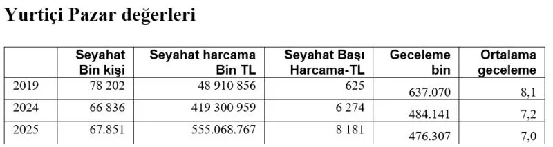 Turizmdatabank verilerine göre Türkiye’de 2025 yılı seyahat verileri, toparlanmanın sınırlı kaldığını ortaya koydu. Yurtiçinde seyahate çıkan kişi sayısı yüzde 2 artarak 55,5 milyona ulaşırken, toplam seyahat sayısı yüzde 1,5 artışla 67,85 milyon oldu. Buna karşın geceleme sayısı yüzde 1,6 düşüşle 476,3 milyona geriledi. 2019 yılıyla karşılaştırıldığında ise seyahat sayısı yüzde 13, geceleme sayısı ise yüzde 25 azaldı. Ortalama geceleme süresi de 7 güne düşerek gerileme gösterdi.
