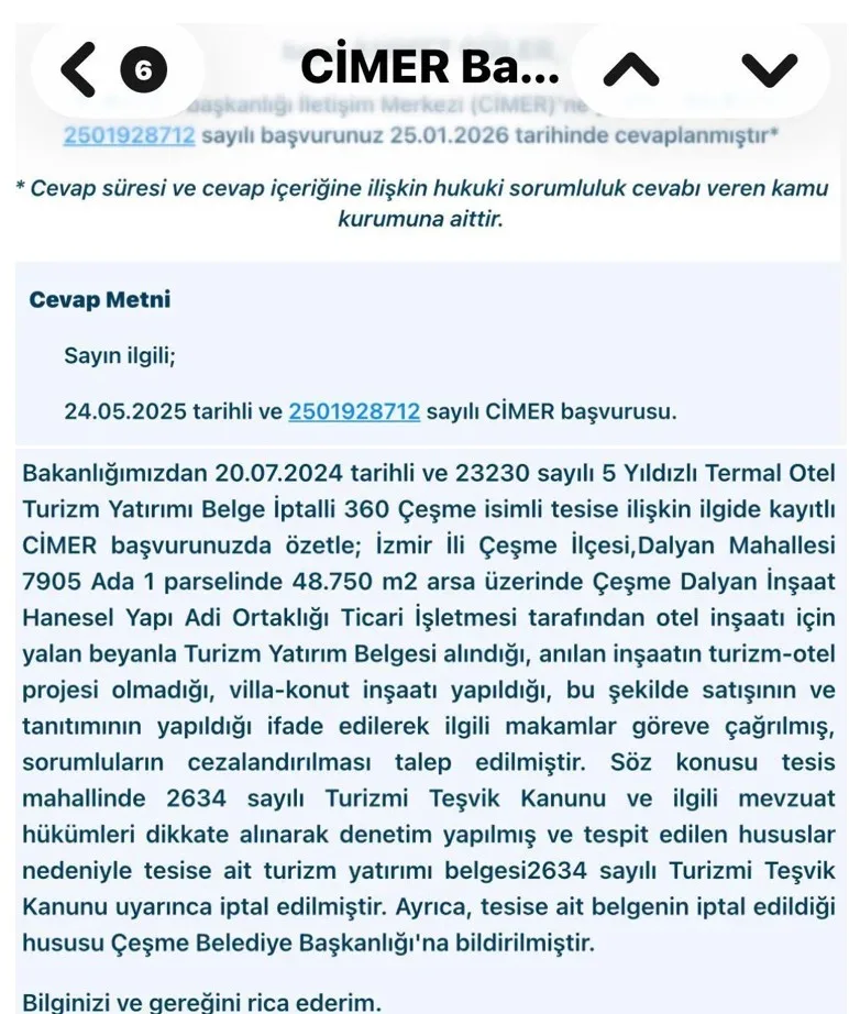 CİMER’e yapılan başvurular sonrası Kültür ve Turizm Bakanlığı, 360 Çeşme Otel projesine verilen Turizm Yatırım Belgesi’ni iptal etti. Projenin villa–konut niteliği taşıdığı ve gerçeğe aykırı beyan içerdiği tespit edildi.