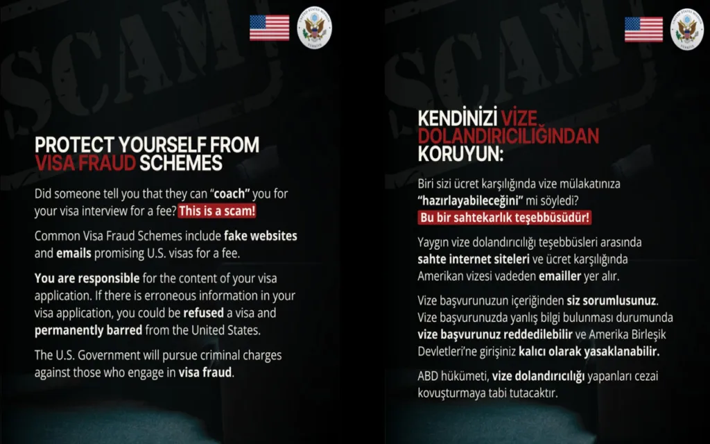 ABD Ankara Büyükelçiliği, vize başvurularında dolandırıcılık riskine karşı uyardı. Sahte siteler ve garanti vize vaat eden kişi ve platformlara karşı dikkatli olunması istendi.
