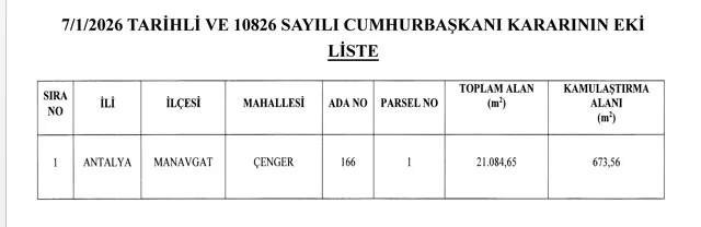 Antalya’nın Alanya ilçesi Çenger Turizm Merkezi sınırları içinde yer alan bazı taşınmazlar, turizm yatırımlarının hayata geçirilmesi amacıyla acele kamulaştırılacak. Söz konusu karar, Cumhurbaşkanı Recep Tayyip Erdoğan’ın imzasıyla alınan 10826 sayılı Cumhurbaşkanı Kararı ile 7 Ocak 2026 tarihli Resmi Gazete’de yayımlanarak yürürlüğe girdi.