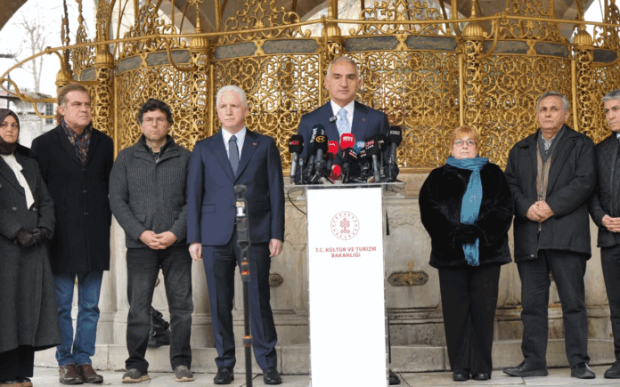 Kültür ve Turizm Bakanı Mehmet Nuri Ersoy, Ayasofya’da Cumhuriyet tarihinin en kapsamlı restorasyonunun sürdüğünü, Sultanahmet Camii’nde ise çalışmaların tamamlandığını açıkladı. Sürecin bilim kurulları denetiminde yürütüldüğü vurgulandı.