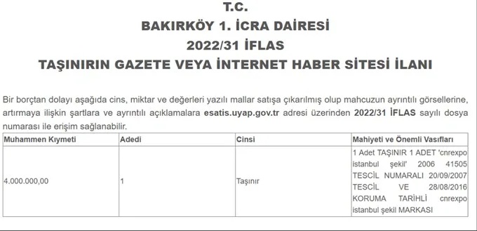 İcra Dairesi’nin yayınladığı ilanlarda, satışların 2022 tarihli iflas kararına dayandığı ifade edildi. Daha önce de CNR Foodİstanbul markasının icradan satışa sunulduğu biliniyor. Fuarcılığın simge markası olan CNR’ın akıbeti ise yapılacak ihaleler sonrasında belli olacak.