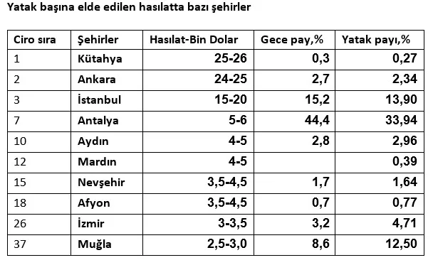 Oysa yatak kapasitesi %0,3 gibi oldukça düşük olan Kütahya, en yüksek geliri sağlayan il konumunda. Hemen arkasından da %2,4’lük kapasitesiyle Ankara geliyor.