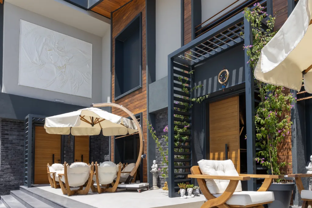 Her bir konaklama ünitesini bir oda olarak tasarladık. Doğayı dinledik; ahşap detayları olan taş evler inşa ettik. İç dizayna baktığımızda; öncelikle misafirimizin odaya girdiğinde bir ferahlık hissetmesini istedik. Bu nedenle oldukça büyük, 60 metrekarelik odalar dizayn ettik. Ahşap ve bambu detaylarla, pastel tonlarda bir dizaynla, soft aydınlatmasıyla huzur ve dinginlik sağlamayı, odada vakit geçirmeyi keyifli ve dinlendirici bir hale getirmek istedik. Örneğin yağmur yağarken kitabını açıp, içeceğini alıp, koltuğa uzanıp bütün gününü bu huzurlu ve konforlu ortamda geçirebilirsin. Odanın ortasında, açıkta bir küvet bulunuyor; bana göre bu sistemde bu bir ihtiyaç. Küvette masaj konsepti vardır. Baş masajı, ayak masajı, vücut masajı… Su seni arındırır. Su sakinlik verir. Yatağında uzanırken suyu açıp sesini dinlersin, önce bu şekilde dinginleşirsin. Ardından suya girer, huzur bulursun. Tekrar yatağına geçersin. Hafif bir müzik açarsın… Odalarımızda televizyon bulunmuyor. Koymak istemedik çünkü televizyon olan odalarda “iyi yaşamın” olamadığını gördük. Tesisin tamamında olduğu gibi, odalarda da Yin Yang dengesini yakalamayı hedefledik.