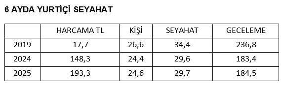 2025’in ilk yarısında iç turizm verileri, 2019’un hâlâ %10 gerisinde. Seyahat sayısı ve geceleme düşerken, harcamalar fiyatlarla birlikte arttı.