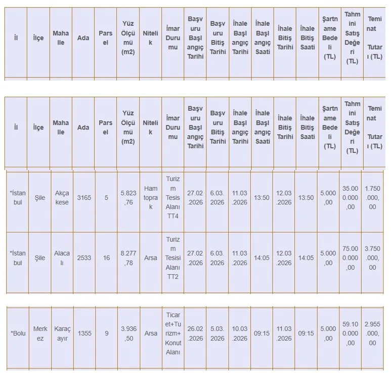 Bazı taşınmazların muhammen bedeli birkaç yüz bin liradan başlarken, bazı büyük projelere uygun alanlarda bu tutar 170 milyon TL’ye kadar çıkabiliyor.