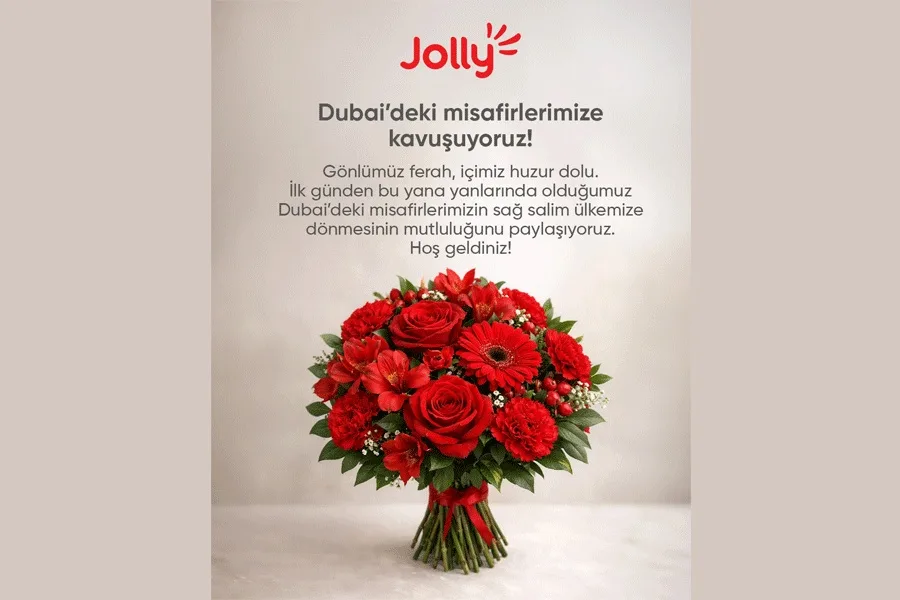 Jolly, Orta Doğu’da yaşanan gelişmelere ilişkin açıklama yaptı. Şirket, Dubai ve bölgede bulunan misafirlerin süreç boyunca yakından takip edildiğini, gerekli desteklerin sağlanarak herhangi bir olumsuzluk yaşanmadan yurda dönüşlerinin gerçekleştirildiğini duyurdu.