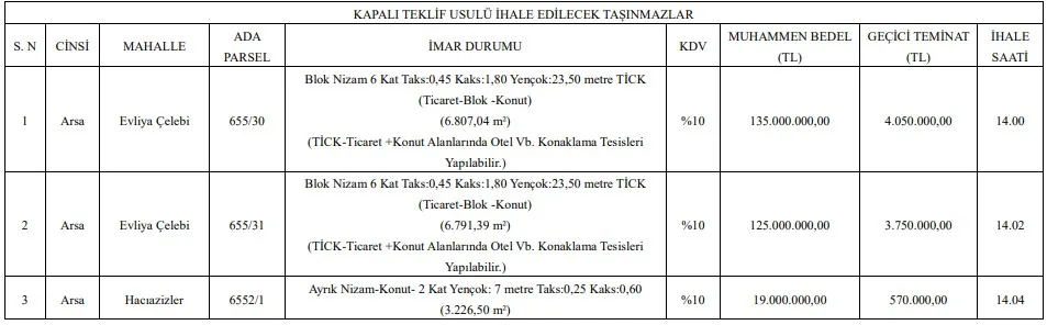 Evliya Çelebi Mahallesi 655 ada 30 ve 31 parsellerde bulunan toplam 13 bin metrekareye yakın iki arsa, TİCK (Ticaret + Konut) imar alanında yer alıyor. İmar planına göre bu alanlarda otel ve benzeri konaklama tesisleri yapılabiliyor. Blok nizam 6 kat, TAKS 0.45, KAKS 1.80 ve 23,50 metre yapı yüksekliğine sahip arsalar, yatırımcılar için turizm ve konaklama projeleri açısından dikkat çekiyor. Söz konusu taşınmazların muhammen bedelleri 135 milyon TL ve 125 milyon TL olarak açıklandı.