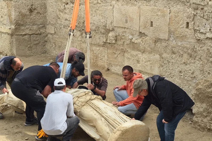 Yaklaşık 2 metre uzunluğundaki heykelin baş kısmı henüz tespit edilemezken beyaz mermerden yapılmış olması dikkat çekti.
