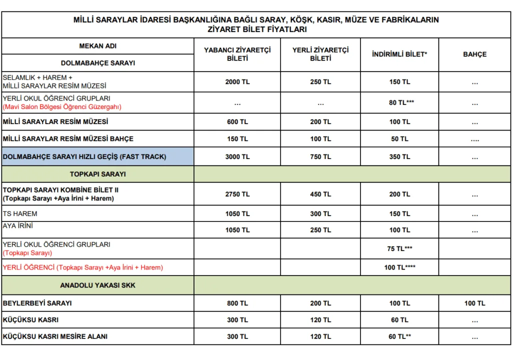 Milli Saraylar İdaresi Başkanlığı’na bağlı saray, köşk, kasır ve müzelerin ziyaret bilet fiyatları güncellendi. Yeni düzenleme kapsamında dolmabahçe Sarayı,Topkapı Sarayı, Beylerbeyi Sarayı ve Yıldız Sarayları başta olmak üzere birçok tarihi mekânda yerli ve yabancı ziyaretçiler için farklı fiyat tarifeleri uygulanmaya başladı.