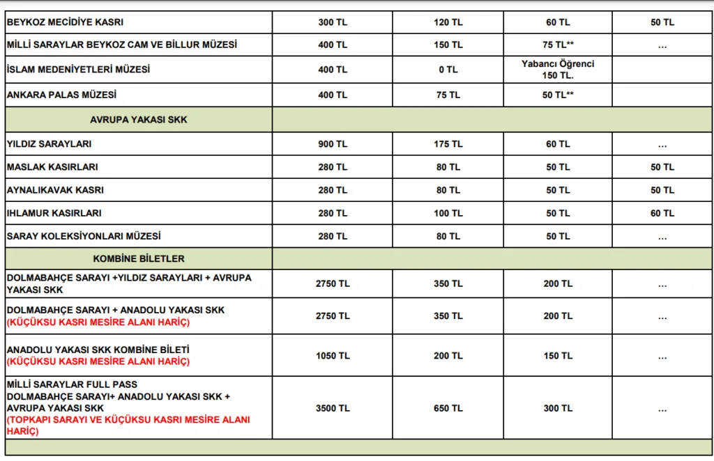 Anadolu Yakası’nda yer alan Beylerbeyi Sarayı’nın yabancı ziyaretçi bileti 800 TL, Küçüksu Kasrı 300 TL, Beykoz Mecidiye Kasrı ise 300 TL olarak açıklandı. Avrupa Yakası’nda bulunan Yıldız Sarayları için yabancı ziyaretçi bileti 900 TL, Ihlamur ve Aynalıkavak kasırları için ise 280 TL seviyesinde belirlendi.