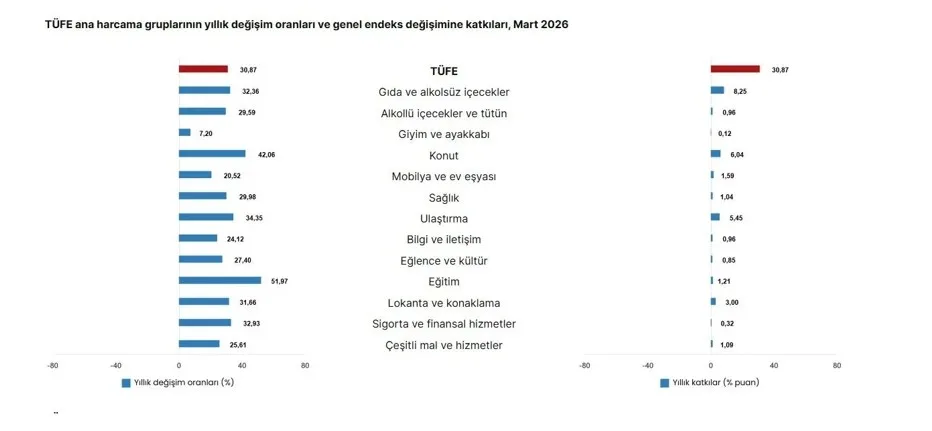 TÜİK’in Mart 2026 verilerine göre yıllık enflasyon yüzde 30,87 olarak gerçekleşti. Aylık enflasyon ise yüzde 1,94 olarak açıklandı. Özellikle küresel gelişmelerin ve savaşın etkisiyle mart ayı verileri yakından takip ediliyordu.