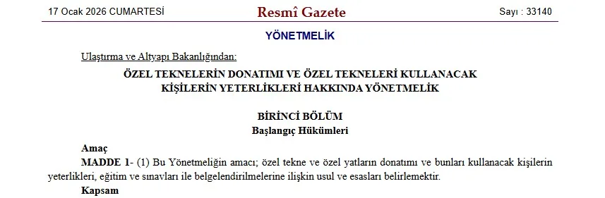 Ulaştırma ve Altyapı Bakanlığı, özel teknelerle ilgili yeni düzenlemeleri kapsayan yönetmeliği Resmî Gazete’de yayımladı. Yönetmelik, özel teknelerin donatımı, kimlerin kullanabileceği, hangi belgelerin gerektiği ve uygulanacak idari yaptırımlar gibi birçok konuda önemli yenilikler içeriyor.
