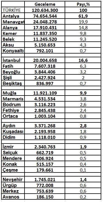 İlçeler bazında ise Antalya’nın Manavgat, Alanya, Kemer ve Belek-Serik ilçeleri belirgin biçimde önde.