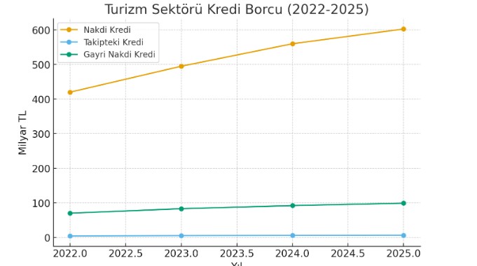 Turizm sektöründe finansal sıkıntılar giderek büyüyor. Bankacılık Düzenleme ve Denetleme Kurumu’nun (BDDK) Temmuz 2025 verilerine göre, sektörün toplam nakdi kredi borcu bir önceki aya göre yüzde 1,2 artarak 602,7 milyar TL’ye yükseldi. Takipteki kredi borcu ise yüzde 7,3 artışla 6,3 milyar TL’ye çıktı. Gayri nakdi kredi tutarı da yüzde 2 artarak 99 milyar TL’ye ulaştı.