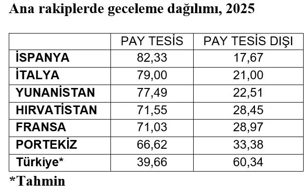 Avrupa ile kıyaslandığında Türkiye’deki durum daha da dikkat çekici. Avrupa Birliği ülkelerinde kiralık konaklama tesislerinin toplam gecelemeler içindeki payı yüzde 25-30 seviyelerinde kalırken, Türkiye’de bu oranın yaklaşık yüzde 60’a ulaştığı tahmin ediliyor. Bu da Türkiye’de alternatif konaklama modelinin çok daha yaygın olduğunu ortaya koyuyor.