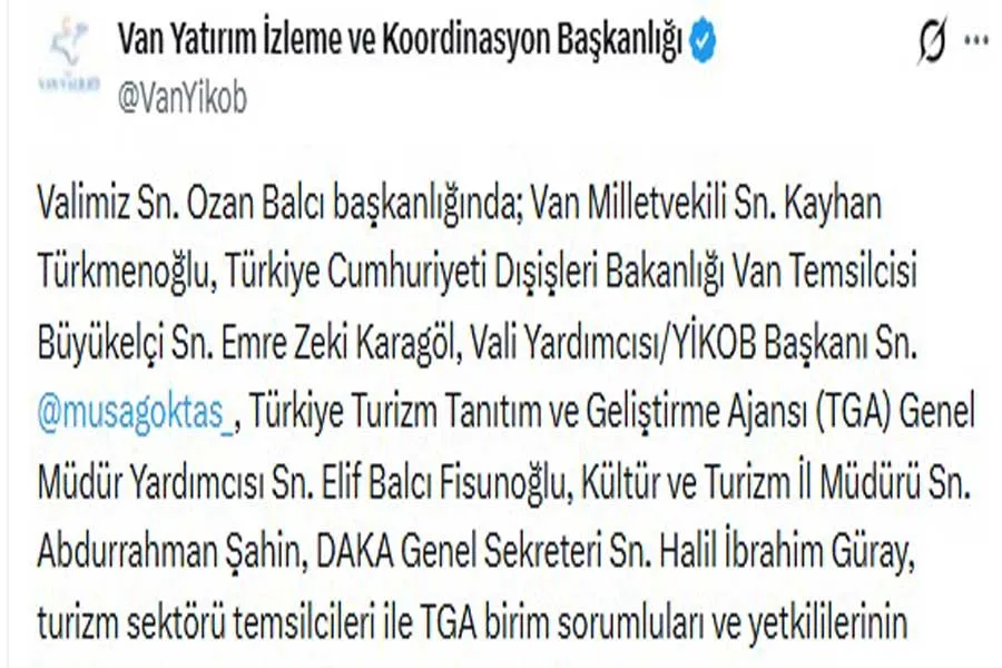 Van Yatırım İzleme ve Koordinasyon Başkanlığı, sosyal medya hesabı üzerinden yaptığı paylaşımla, Van’da kültür ve turizm alanında önemli bir istişare toplantısı gerçekleştirildiğini duyurdu.