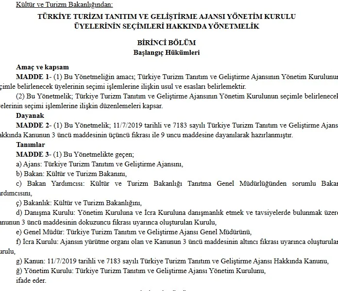 Kültür ve Turizm Bakanlığı tarafından yayımlanan yeni yönetmelikle, Türkiye Turizm Tanıtım ve Geliştirme Ajansı’nın (TGA) seçimle belirlenecek yönetim kurulu üyelerinin seçilmesine ilişkin usul ve esaslar yeniden düzenlendi. Yönetmelik, 11 Temmuz 2019 tarihli ve 7183 sayılı kanuna dayanarak hazırlandı ve Resmî Gazete’de yayımlanarak yürürlüğe girdi.