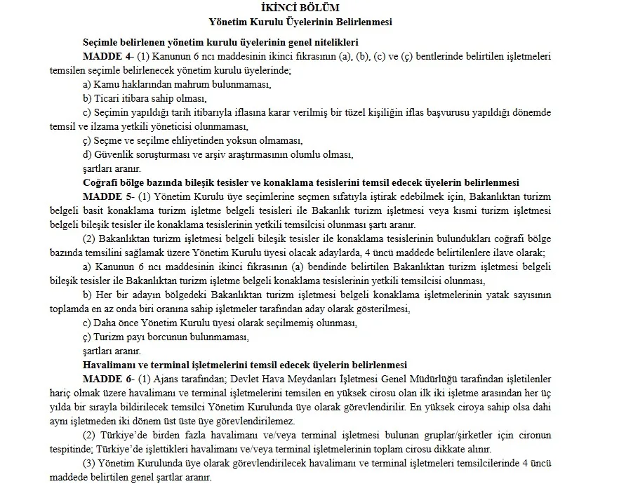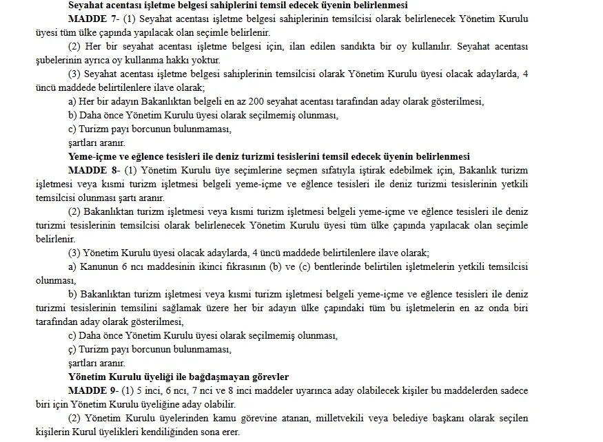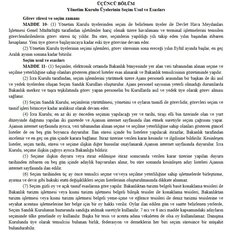 Yeni düzenlemeye göre, Ajans yönetiminde yer alacak üyelerin seçim süreci elektronik ortamda ve Bakanlık gözetiminde yürütülecek. Konaklama tesisleri, seyahat acentaları, yeme-içme ve eğlence işletmeleri ile deniz turizmi tesisleri gibi farklı sektör temsilcileri belirlenen kriterler doğrultusunda aday olabilecek.