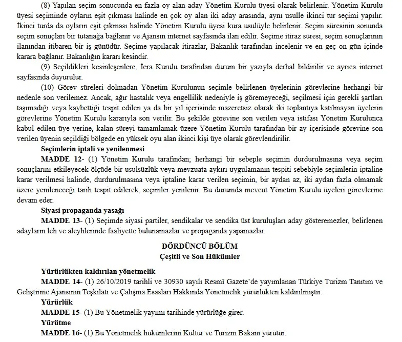 Türkiye Turizm Tanıtım ve Geliştirme Ajansı’nın (TGA) yönetim kurulu seçimlerine ilişkin usul ve esaslar güncellendi. Yeni düzenleme Resmî Gazete’de yayımlanarak yürürlüğe girdi.
